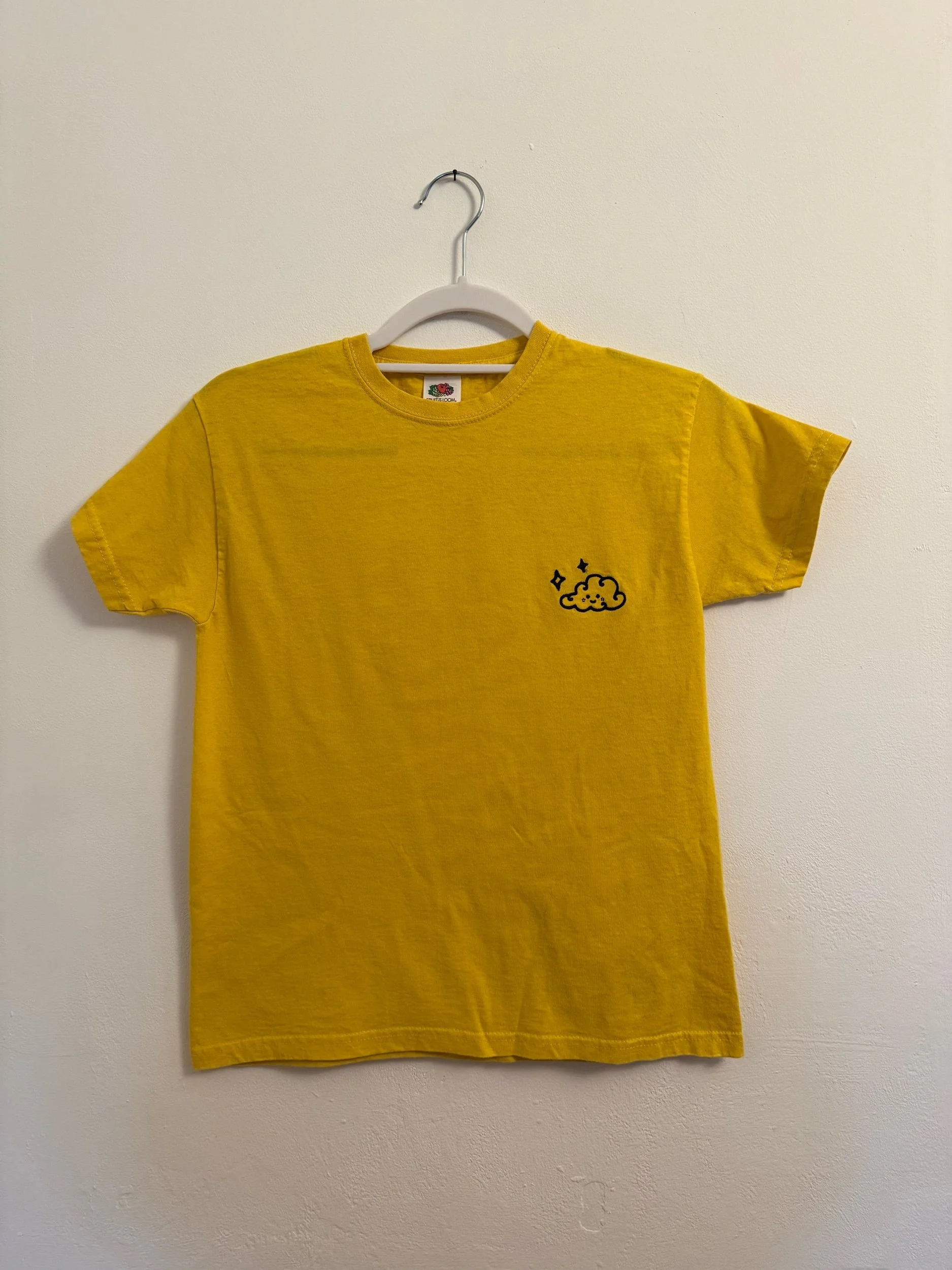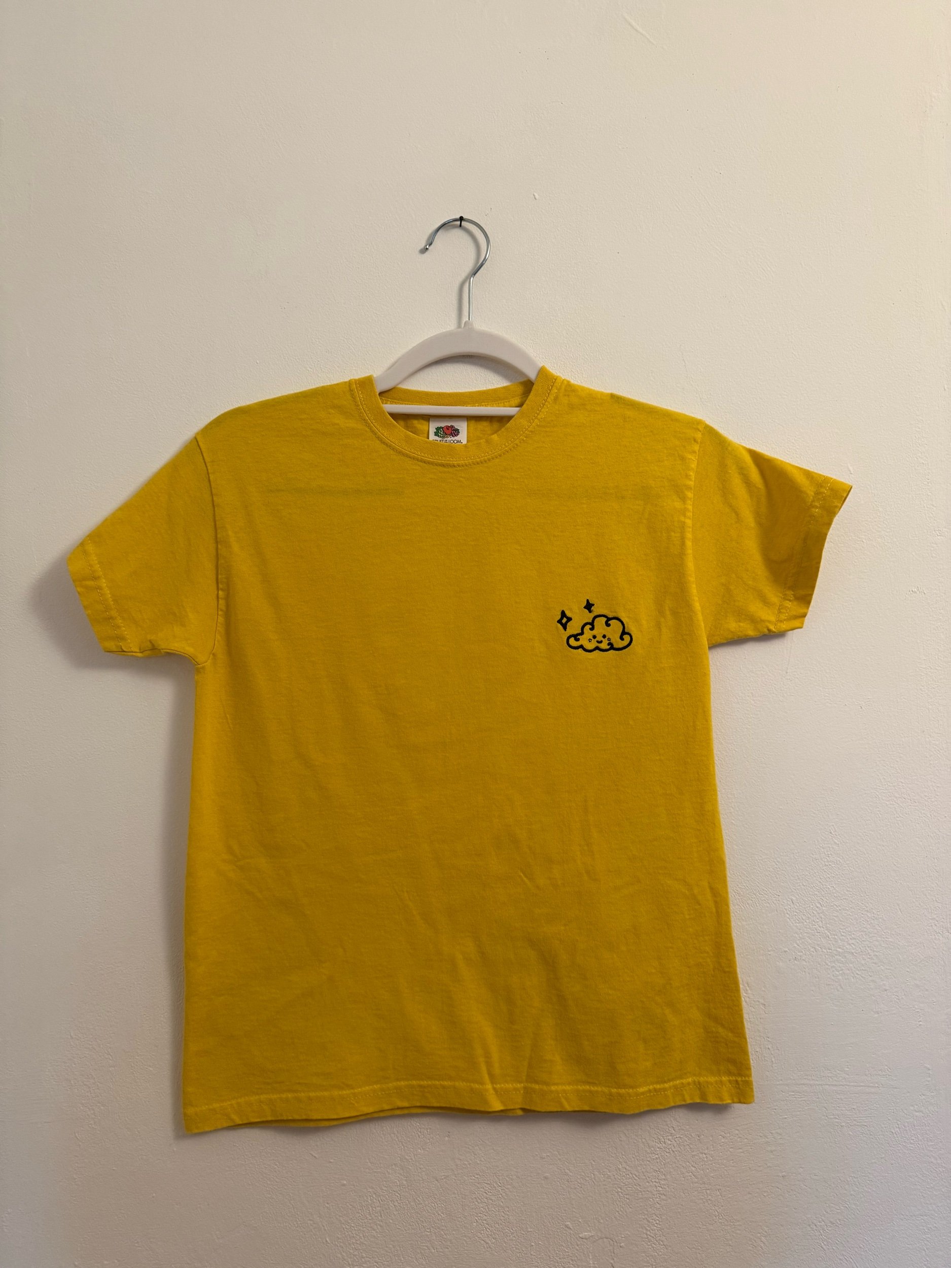 T-shirt jaune brodé avec amour avec un motif de nuage mignon, Claude le cloud notre mascotte, pour les jeunes rêveurs et rêveuses !